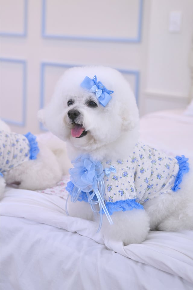 穏やかなフラワーパターンと組み合わせたリボンピン、ブルームコサージュアクセサリーでラブリーさをさらにプラス
