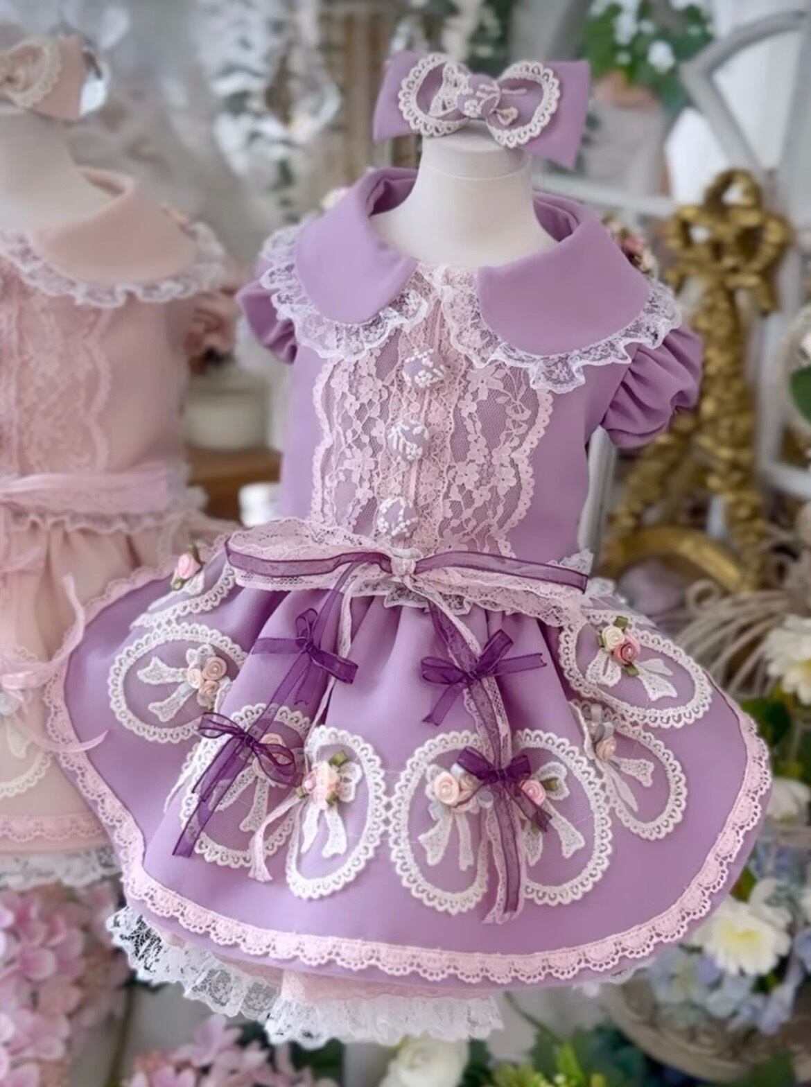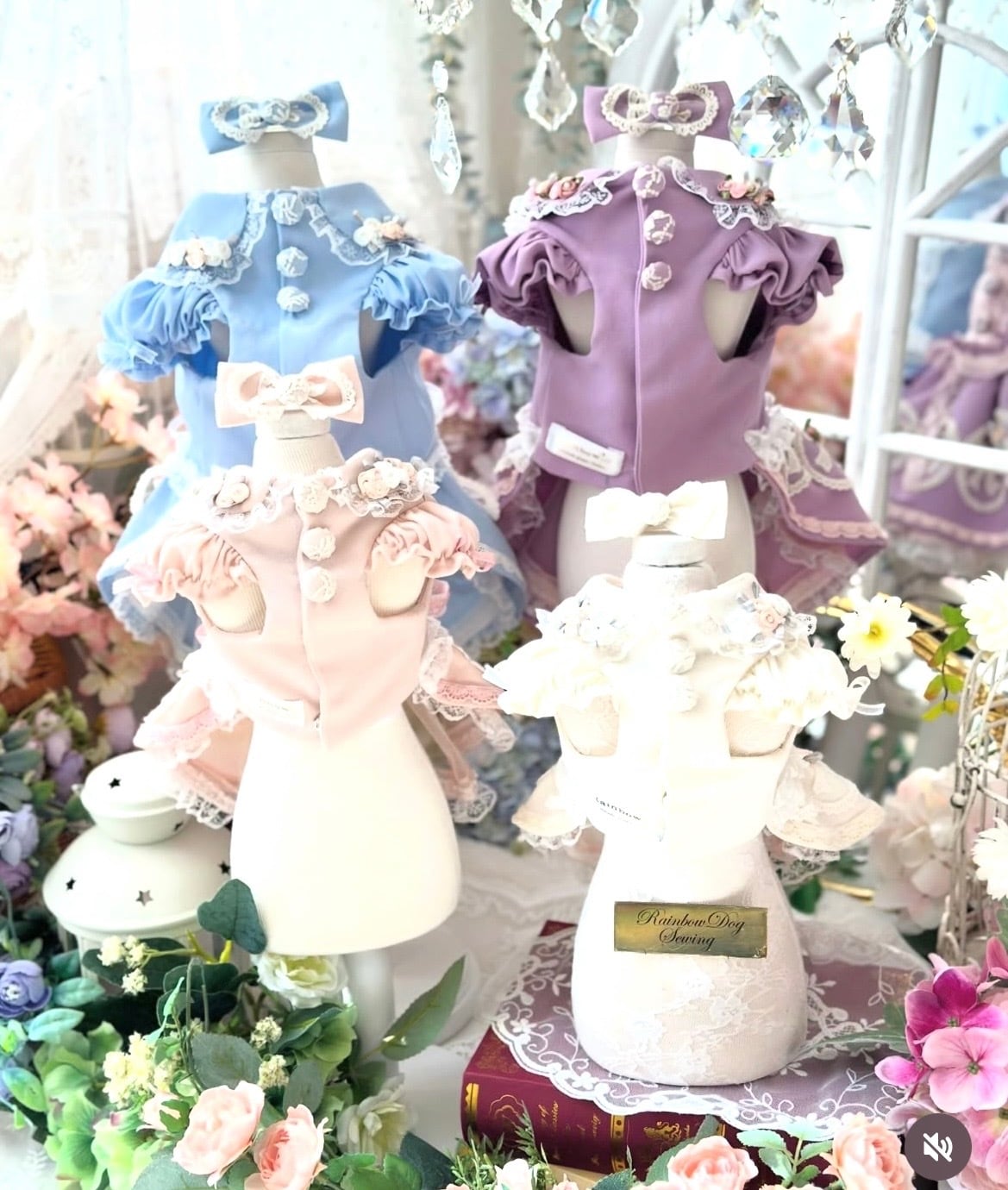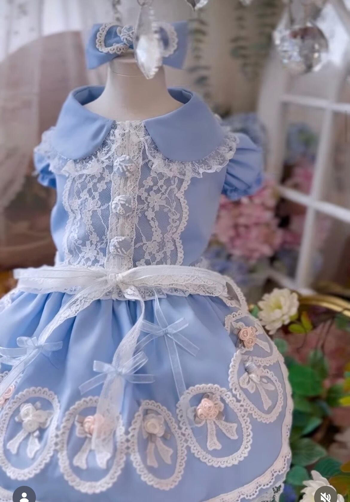 ◼️ リボンやレース、バラをあしらったとってもキュートなワンピース。襟元のお花がとっても可愛いお嬢様なお洋服一点一点お作りするオートクチュールなので、縫製と確かでお勧めです♪